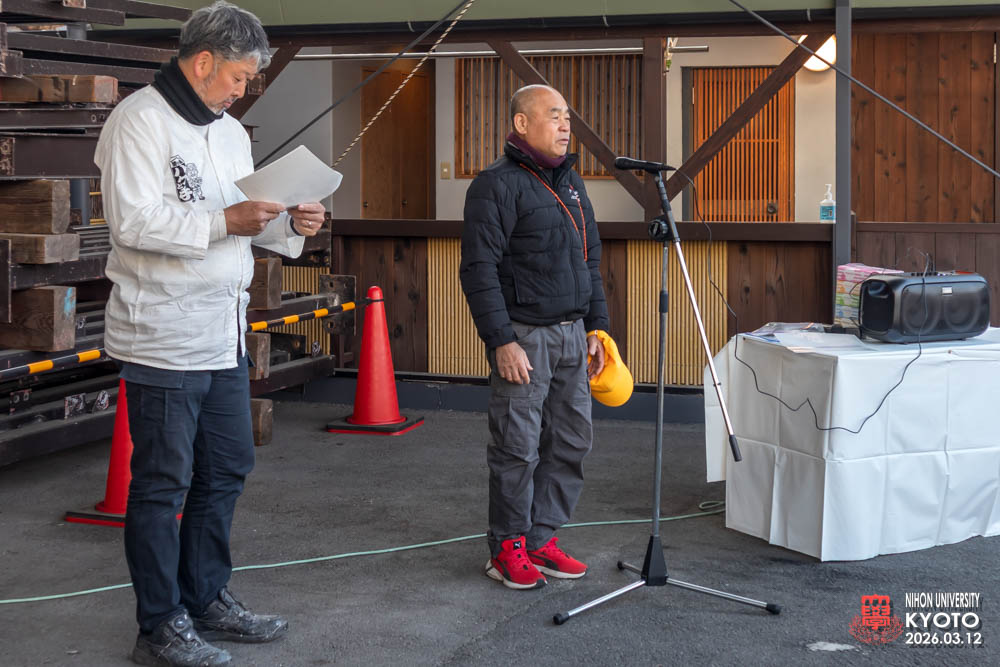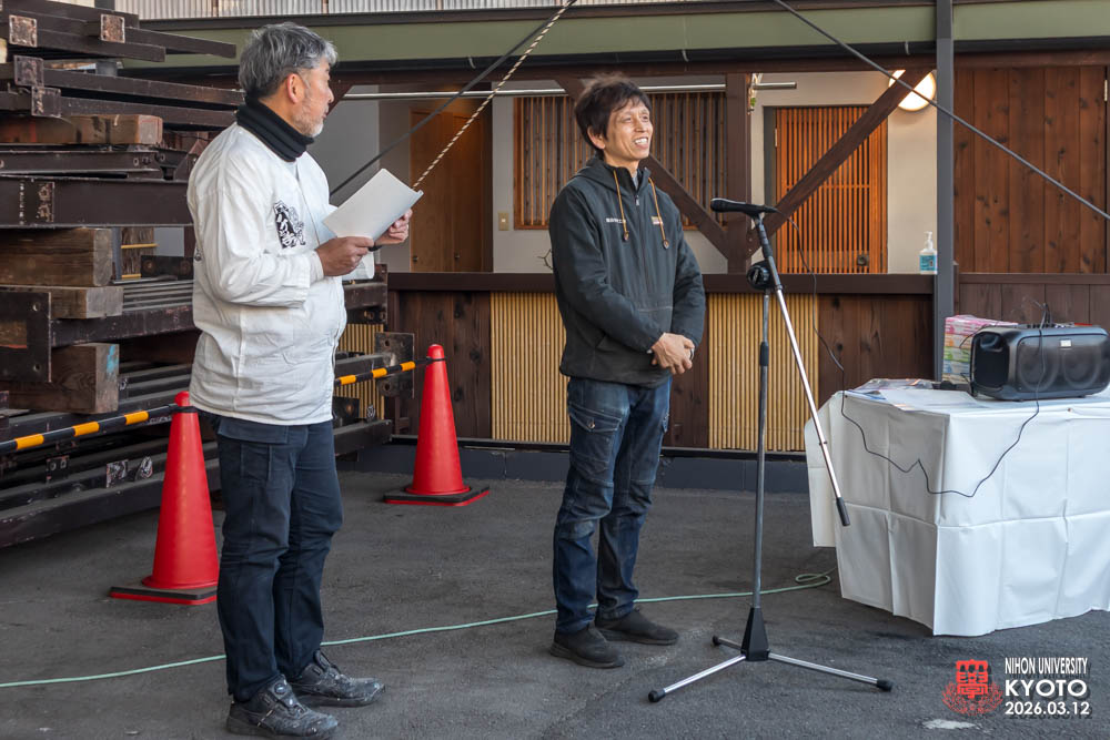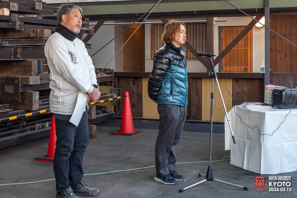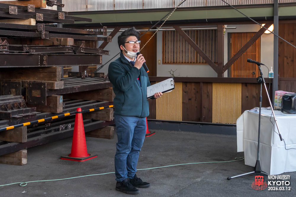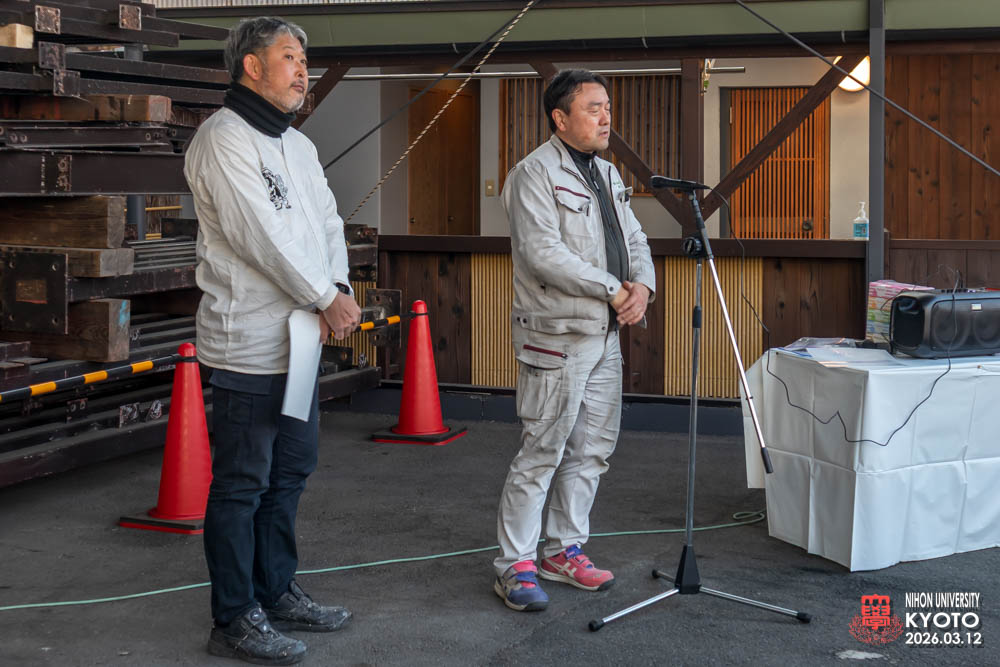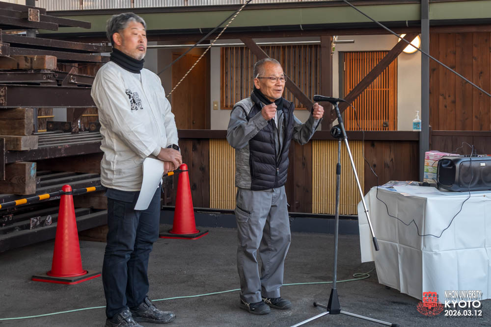 最後の締めに座学の為にお越し願った桜門建築会 会長 今村 雅樹様より御挨拶いただき、次に引率の先生方師橋教授、福村助教、古田助教が開催者に対してお礼のご挨拶をいただきました。学生達に模型等で作品の制作はすれど本物の材料により五感を磨き体験する機会は大変すばらしい事で実現した熊倉工務店及び協力業者の方々にお礼を申し上げられました。
