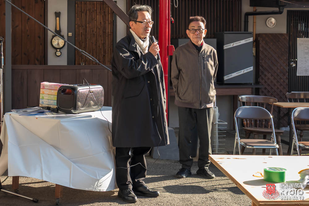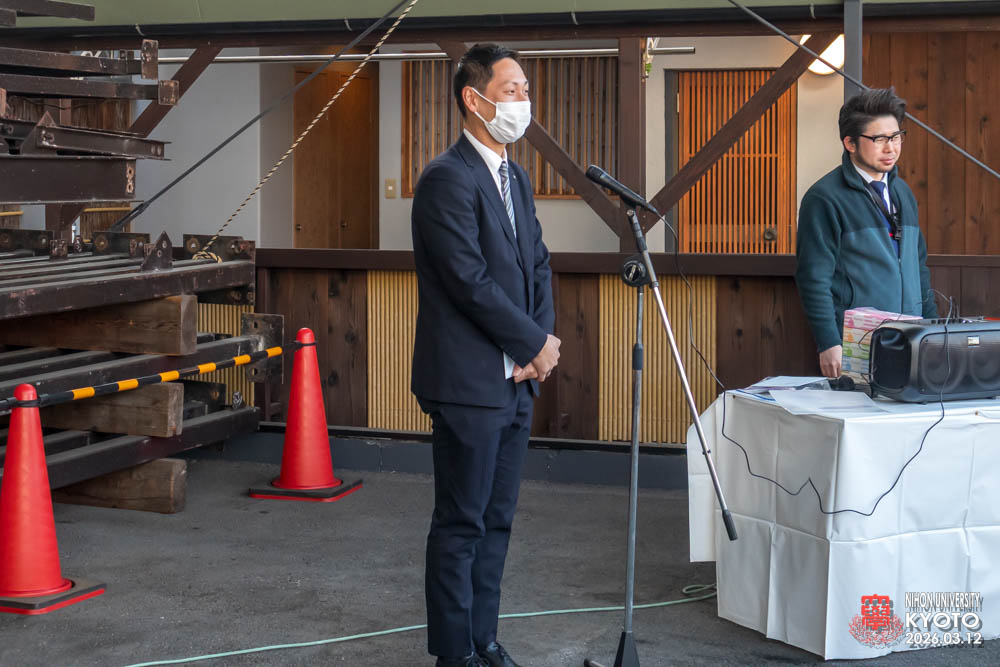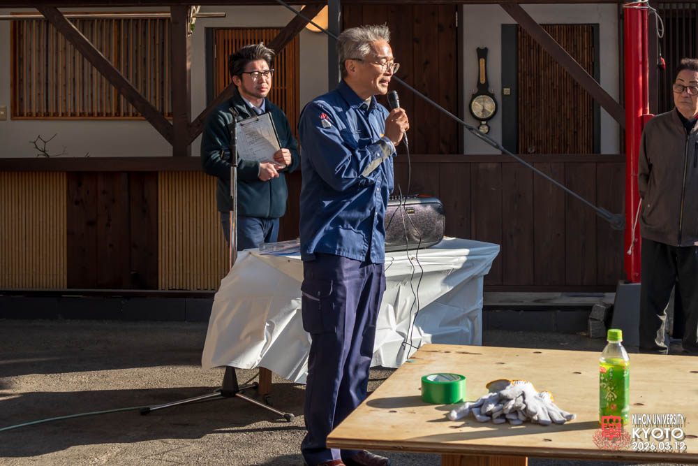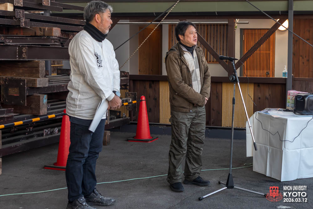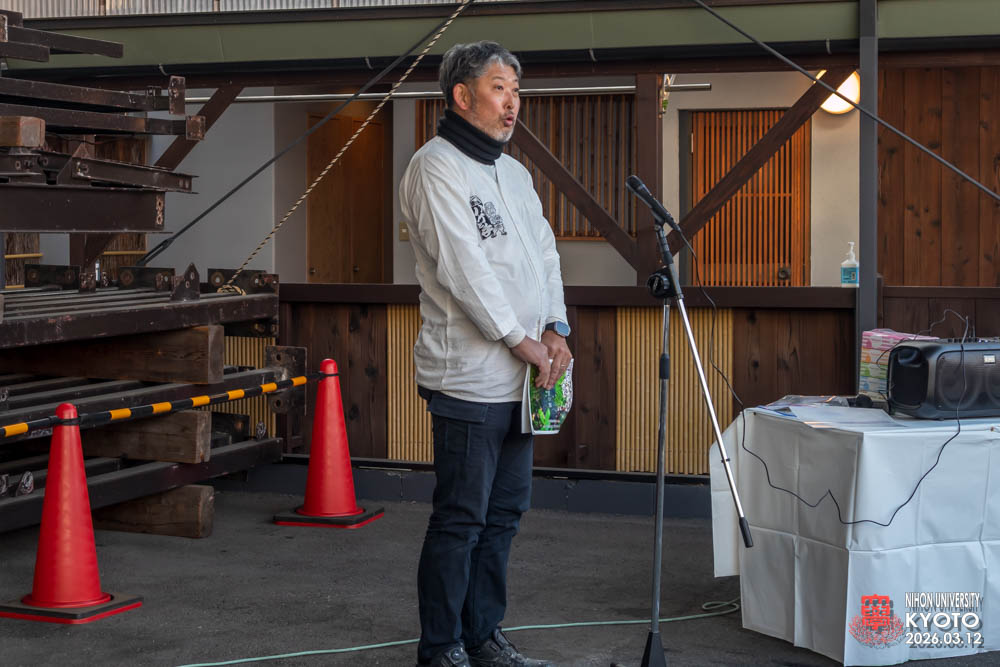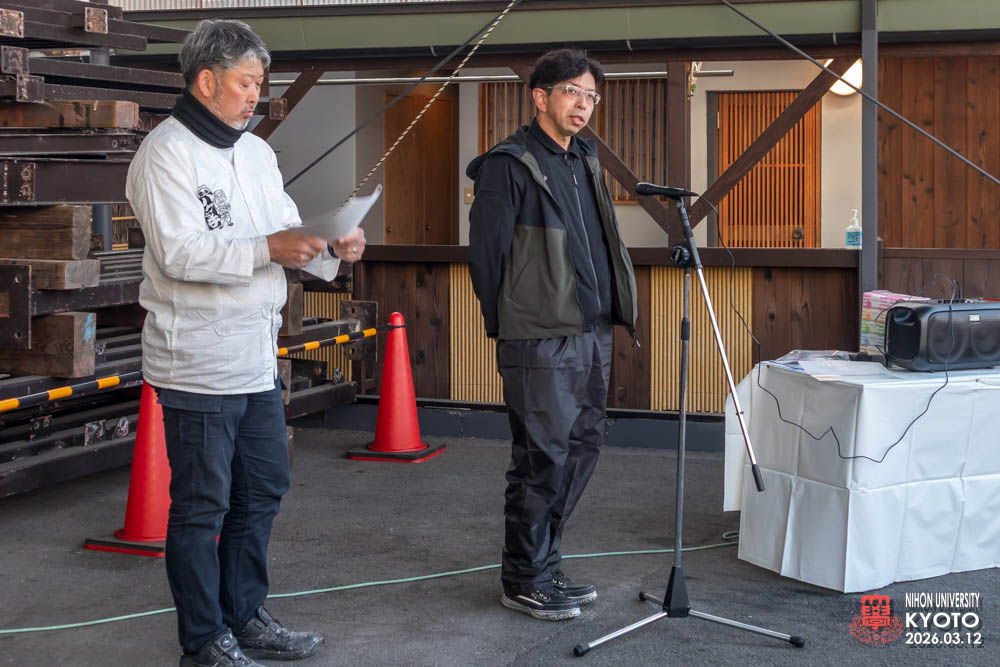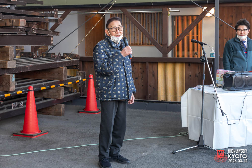 最後の締めに座学の為にお越し願った桜門建築会 会長 今村 雅樹様より御挨拶いただき、次に引率の先生方師橋教授、福村助教、古田助教が開催者に対してお礼のご挨拶をいただきました。学生達に模型等で作品の制作はすれど本物の材料により五感を磨き体験する機会は大変すばらしい事で実現した熊倉工務店及び協力業者の方々にお礼を申し上げられました。