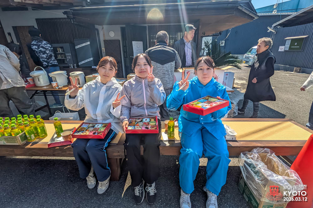 今回は豪華なお弁当と豚汁を用意し現場仕上げの切りの良いところで各人が好きな場所で自由に食事をしていただく設営をいたしました。